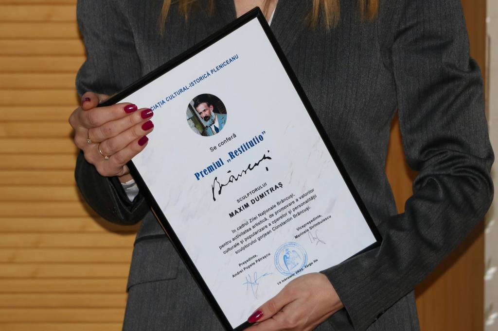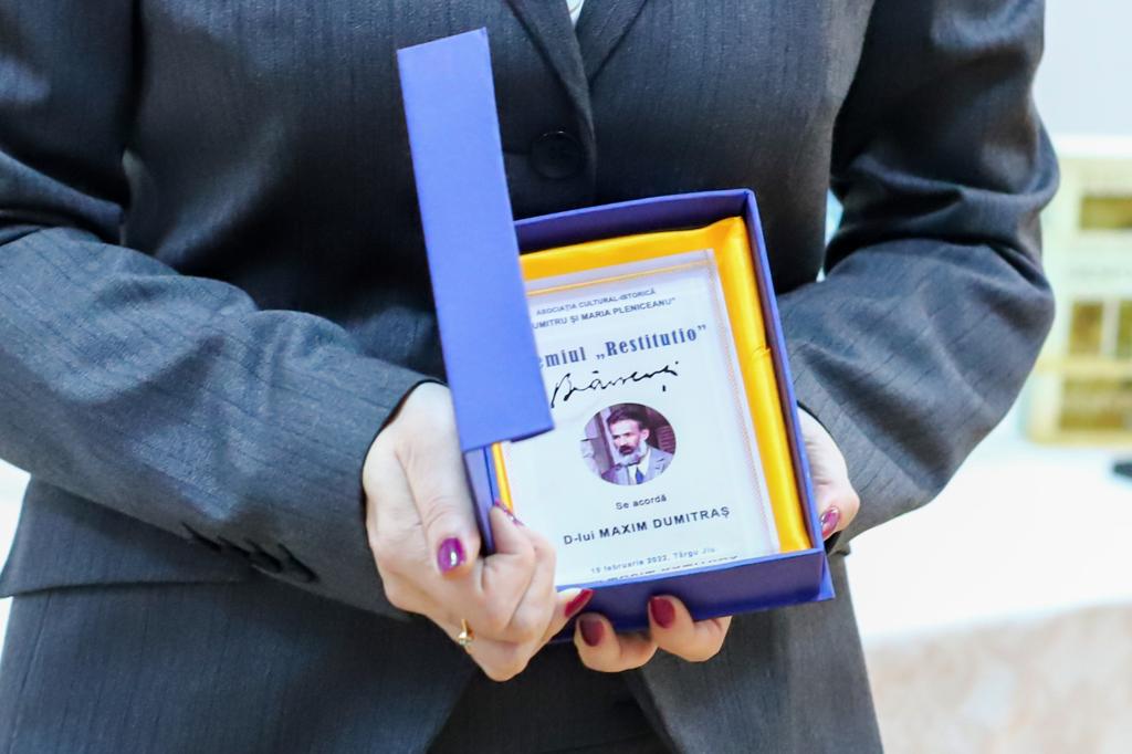 „Premiul „Restitutio. Brâncuși”, acordat în acest an lui Maxim Dumitraș, este un semn al normalului în care arta, în general, sculptura românească, în mod deosebit, trebuie să respire. Conform Statutului, Asociația Pleniceanu instituie și conferă premii personalităților culturii și istoriei pentru activitățile depuse, acordând din anul 2019, cu ocazia Zilei Naționale Brâncuși, Premiul „Restitutio. Brâncuși”, celor care prin activitatea lor contribuie la popularizarea operelor și personalității sculptorului gorjean”, ne-a declarat Andrei Popete Pătrașcu, președintele Asociației.
