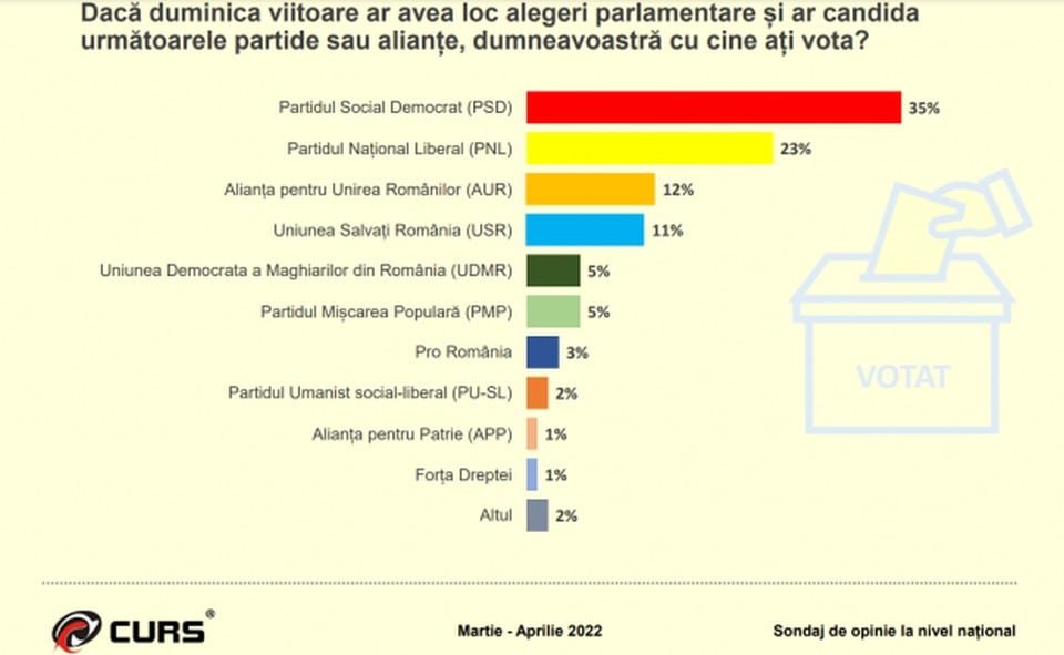 Dacă duminica viitoare ar avea loc alegeri parlamentare, PSD ar obţine 35% din voturi, urmat de PNL cu 23% din voturi şi de AUR – 12%, relevă datele unui sondaj CURS realizat în intervalul 28 martie – 11 aprilie.