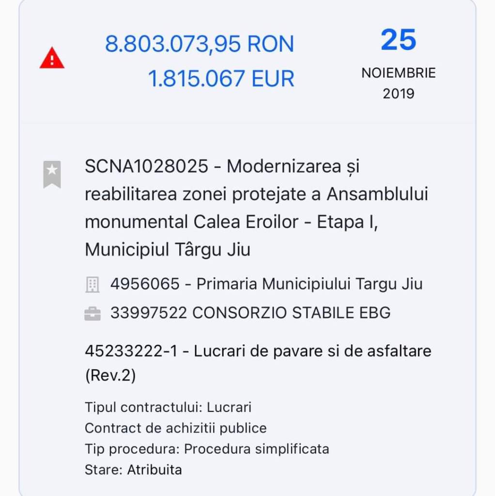 În urmă cu mai bine de doi ani, primarul din Târgu Jiu semna un contract pentru modernizarea și reabilitarea zonei protejate a Ansamblului Monumental „Calea Eroilor” cu firma italiană Consorzio Stabile EBG SRL, înființată în 2015, având un singur angajat. Valoarea contractului atribuit prin procedură simplificată de către Primăria Târgu Jiu, firmei din Italia, în data de 25 noiembrie 2019, a fost de 1.815.067 EUR, adică 8.803.073,95 RON, constând în lucrări de pavare și de asfaltare.
