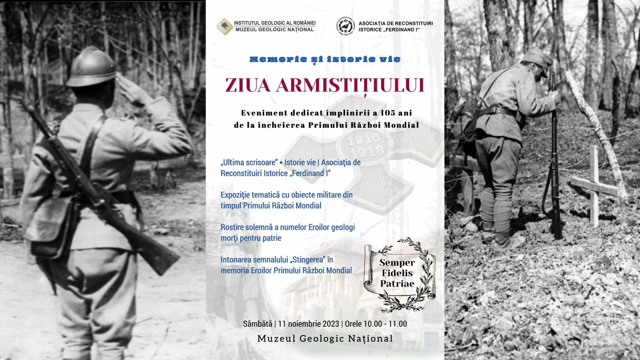 Sâmbătă, 11 noiembrie 2023, Asociația de Reconstituiri Istorice „Ferdinand I” și Muzeul Geologic Național vor comemora printr-un eveniment dedicat Zilei Armistițiului, împlinirea a 105 ani de la încheierea Primului Război Mondial. Manifestarea are scopul de a aduce în atenția publicului importanța păstrării și cinstirii memoriei Eroilor care s-au jertfit în timpul războiului.